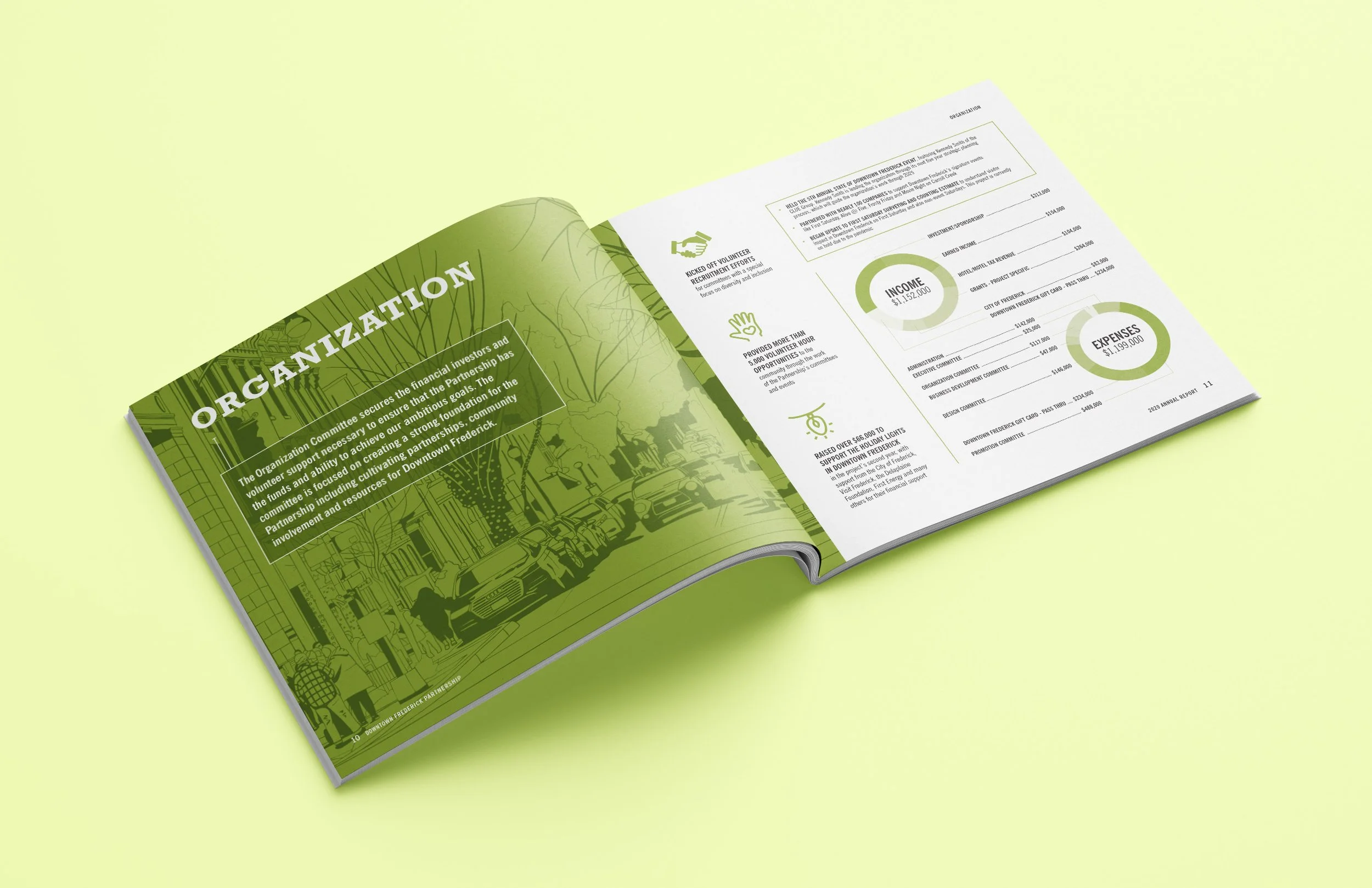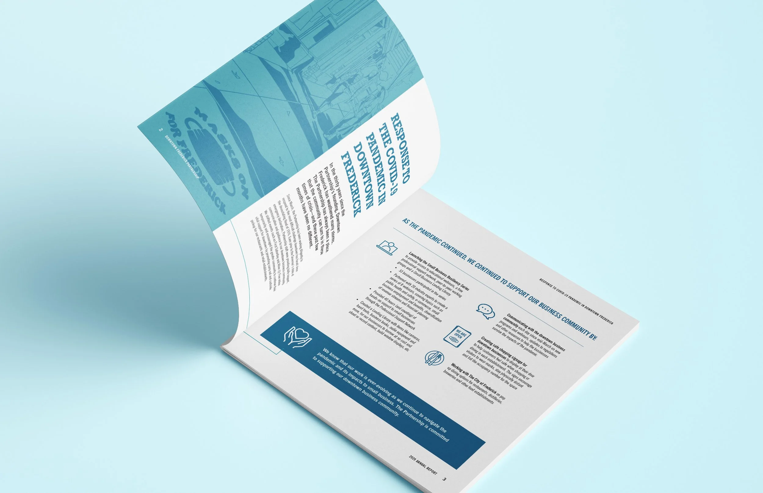 Downtown Frederick Partnership is a nonprofit organization founded in 1990 that strives to promote and support the Downtown Frederick community. For their 2019-2020 annual report, they were looking for something fresh and exciting to draw attention to the many accomplishments of the past fiscal year. We utilized the Partnership’s expansive color palette, illustrated designs based on chosen imagery for each section, and eye-catching icons and infographics to develop a vibrant and inviting annual report that keeps you wanting to turn the page to see what’s next.