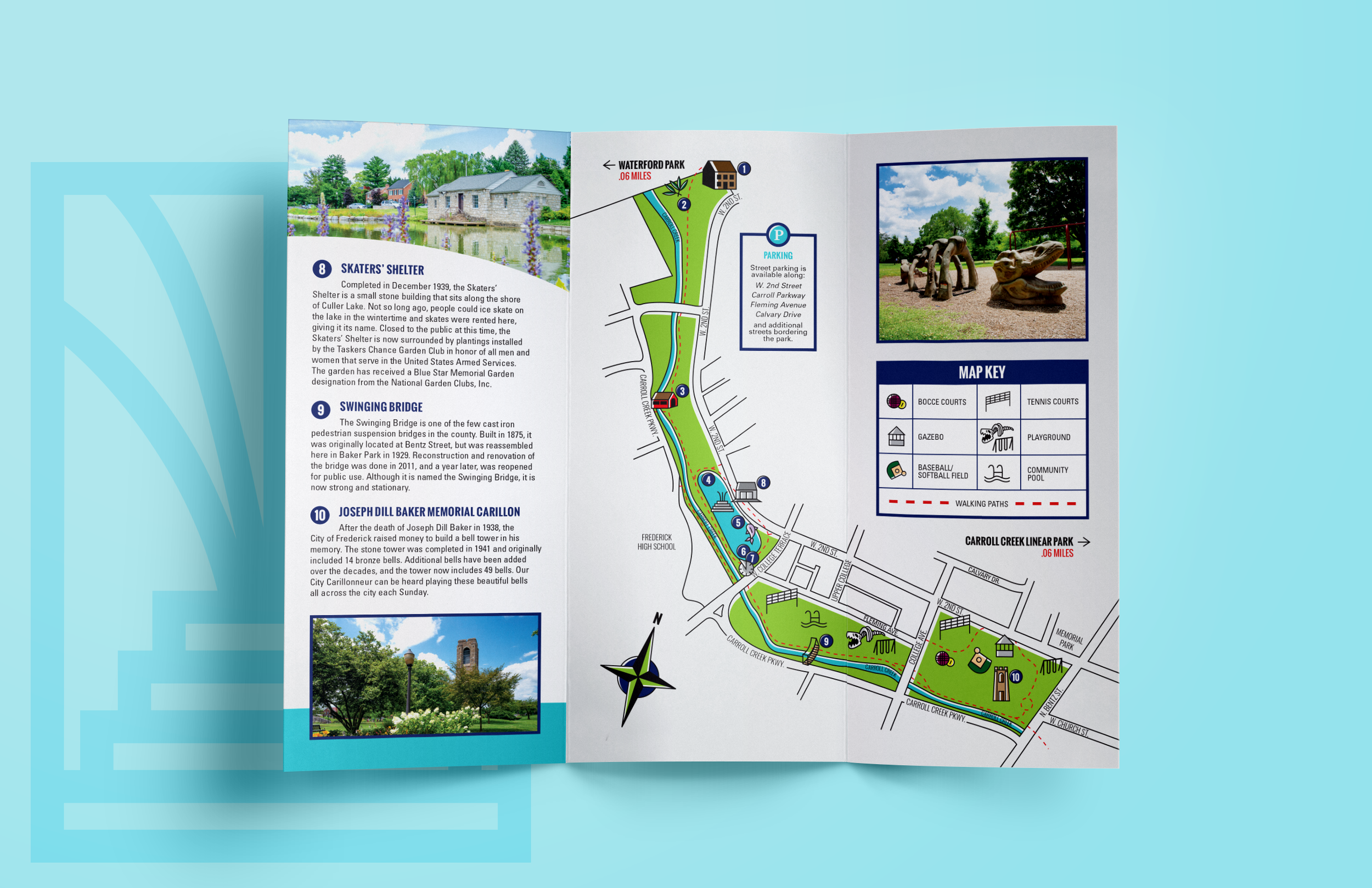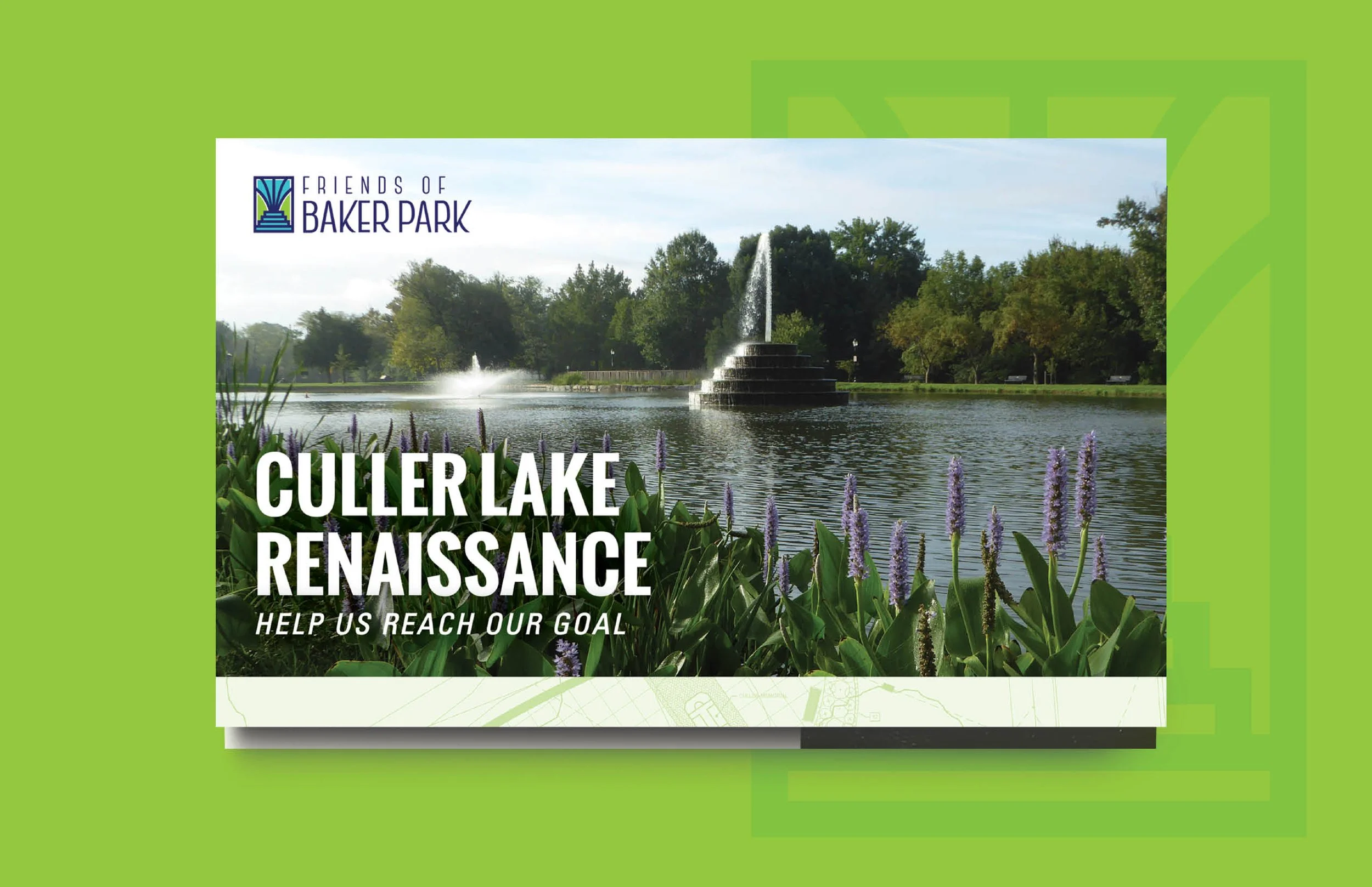 Friends of Baker Park was looking for an updated brand coinciding with the Culler Lake Renaissance project and representative of their commitment to and the beauty of Baker Park. Working with the marketing team and the Friends of Baker Park, we created a logo that highlighted the feature fountain of the park with a crossed vintage and modern style to maintain the history of the park. Expanding the brand to collateral, illustrations from the various points in the park worked to create a walking tour brochure. A versatile color palette and font selection culminated in the Culler Lake Renaissance Project giving brochure.